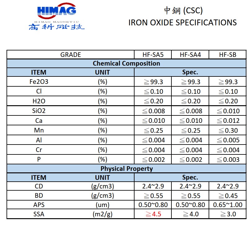 中钢所产出的氧化铁具有高稳定度与高纯度,广泛应用于磁性材料。高科磁技为中钢唯一授权的销售单位。